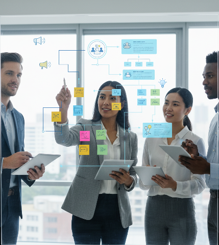 We help you develop a comprehensive change strategy that aligns with your overall business objectives, identifying key stakeholders, assessing change readiness, and outlining a clear roadmap for communication and engagement.